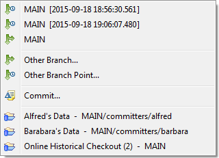 Offline and online transactional checkouts can be merged from other time stamps or other branches from the same repository by selecting the checkout, opening the context menu and selecting the Merge From sub menu: