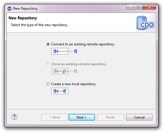 The CDO Repositories View provides a uniform way to work with different types of CDO repositories. Only at creation or connection time the differences between the repository types become apparent.